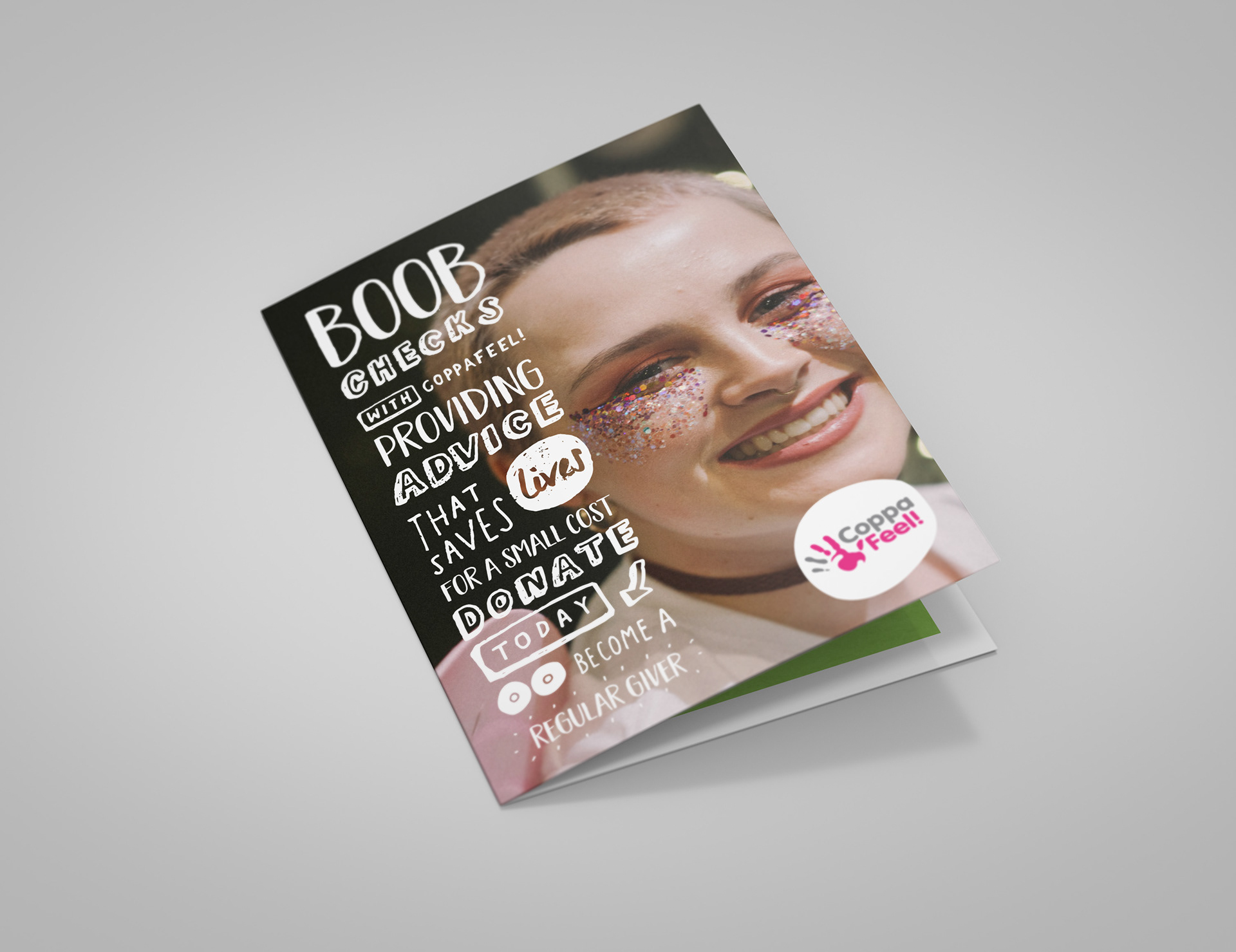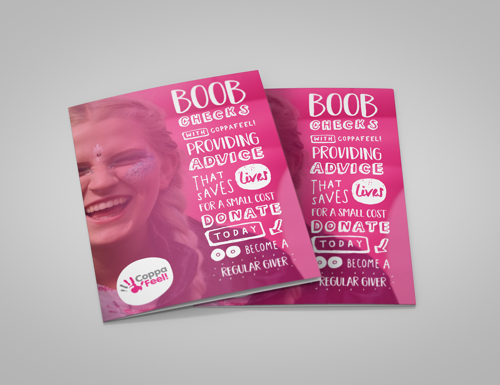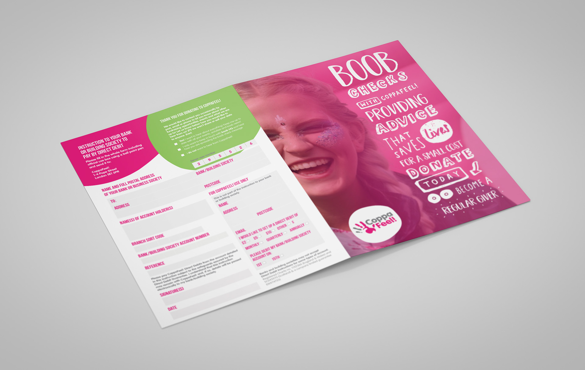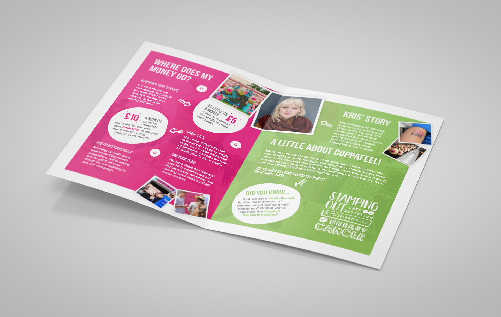 New, hand-drawn style for CoppaFeel!'s 'Just Giving' leaflet. Work created at / owned by Chemical Code Ltd.